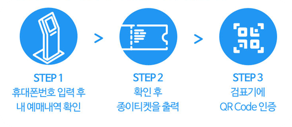 현장 키오스크에서 예매내역으로 종이티켓을 출력해 입장합니다.